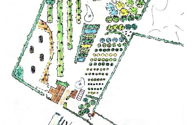 Description rapide des espèces : Moutons pour entretien sur les lisières, fauchage par faux, serres froides, bassin naturelle avec trop pleins repartis entre les haies, culture de scions de fruitiers entre haies fruitières, guildes végétales, apiculture naturelle, brise vents et mise en place de microclimats, pépinière sous houppier.