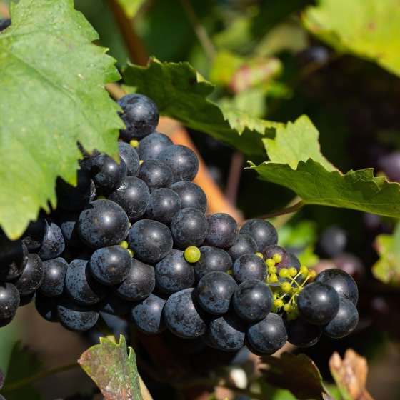 - Description du fruit : Raisins noirs, calibre moyen, avec une peau épaisse, grain moyen à petit, grappe petite. Doux, avec des notes de fraise